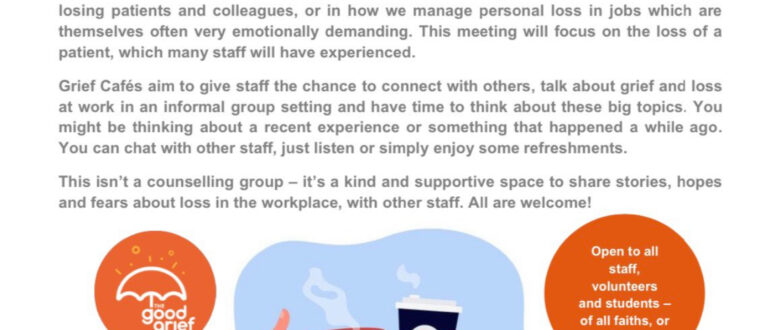 Grief Cafes aim to give staff the chance to connect with others, talk about grief and loss at work in an informal group setting and have time to think about these big topics. You might be thinking about a recent experience or something that happened a while ago. You can chat with other staff, just listen or simply enjoy some refreshments. This isn’t a counseling group – it’s a kind and supportive space to share stories, hopes and fears about loss in the workplace, with other staff. All are welcome!