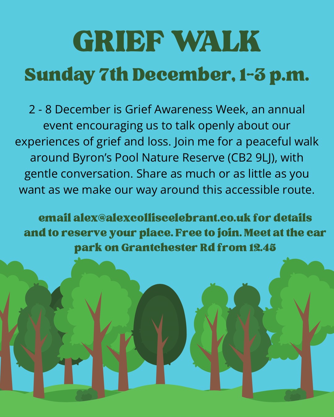 Join me for a peaceful walk around Byron’s Pool Nature Reserve (CB2 9LJ), with gentle conversation. Share as much or as little as you want as we make our way around this accessible route. Email [email protected] for details and to reserve your place.