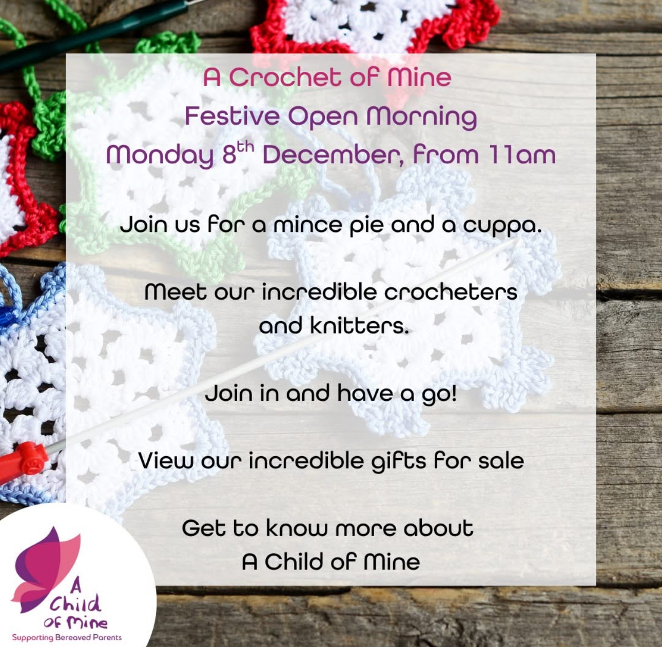 We can not wait to open the office door on Monday the 8th December from 11am for their Christmas Craft Stall and open meeting. This is the perfect opportunity to grab some beautifully handmade Christmas gifts, decorations and stocking fillers. There will also be an opportunity to have a go at crochet or knitting and get to know the group, all materials are provided. Gayle and Kirsty will be there ready to serve hot drinks, pass the mince pies around and share more information about the incredible and vital work that goes on at A Child of Mine 💜 For more information please email Kirsty on: [email protected]