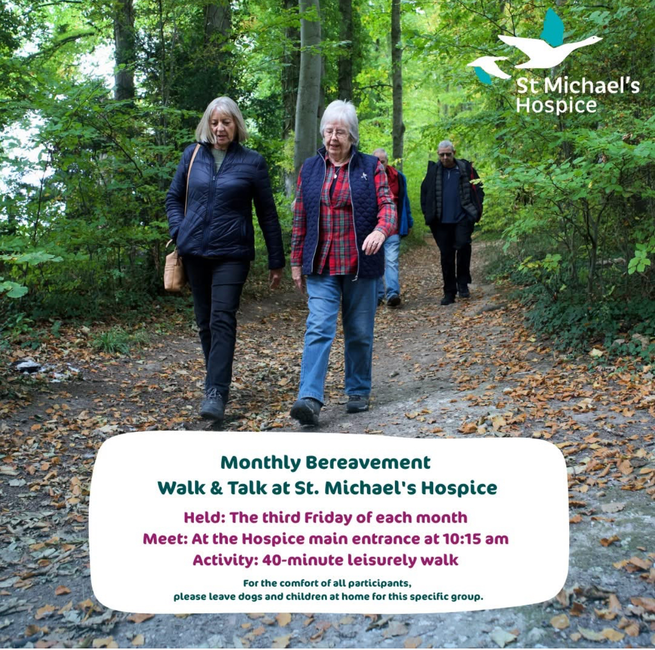 We warmly invite anyone supported by St. Michael’s Hospice to join our supportive, monthly Walk & Talk Group. This is a relaxed opportunity to connect with others in a shared space, enjoy some fresh air, and benefit from gentle activity. A supportive friend is welcome to join you.
