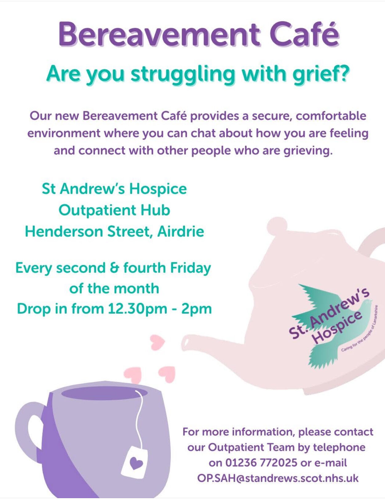 Our Bereavement Café will be open this Friday 28th November. Drop in to our Outpatient Hub between 12.30pm – 2pm. No appointment necessary. Our Bereavement Café provides you with a safe and comfortable environment where you can have a cuppa and chat about how you are feeling, as well as connect with other people who are grieving too. The Bereavement Café runs every 2nd and 4th Friday of the month. We look forward to welcoming you.