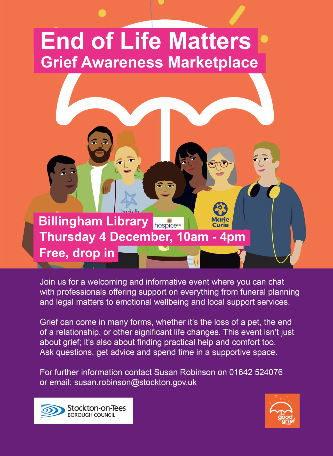 Join us for a welcoming and informative event where you can chat with professionals offering support on everything from funeral planning and legal matters to emotional wellbeing and local support services. Grief can come in many forms, whether it’s the loss of a pet, the end of a relationship, or other significant life changes. This event isn’t just about grief; it’s also about finding practical help and comfort too. Ask questions, get advice and spend time in a supportive space. Thursday 4 December, 10am – 4pm. For further information contact Susan Robinson on 01642 524076 or email: [email protected].