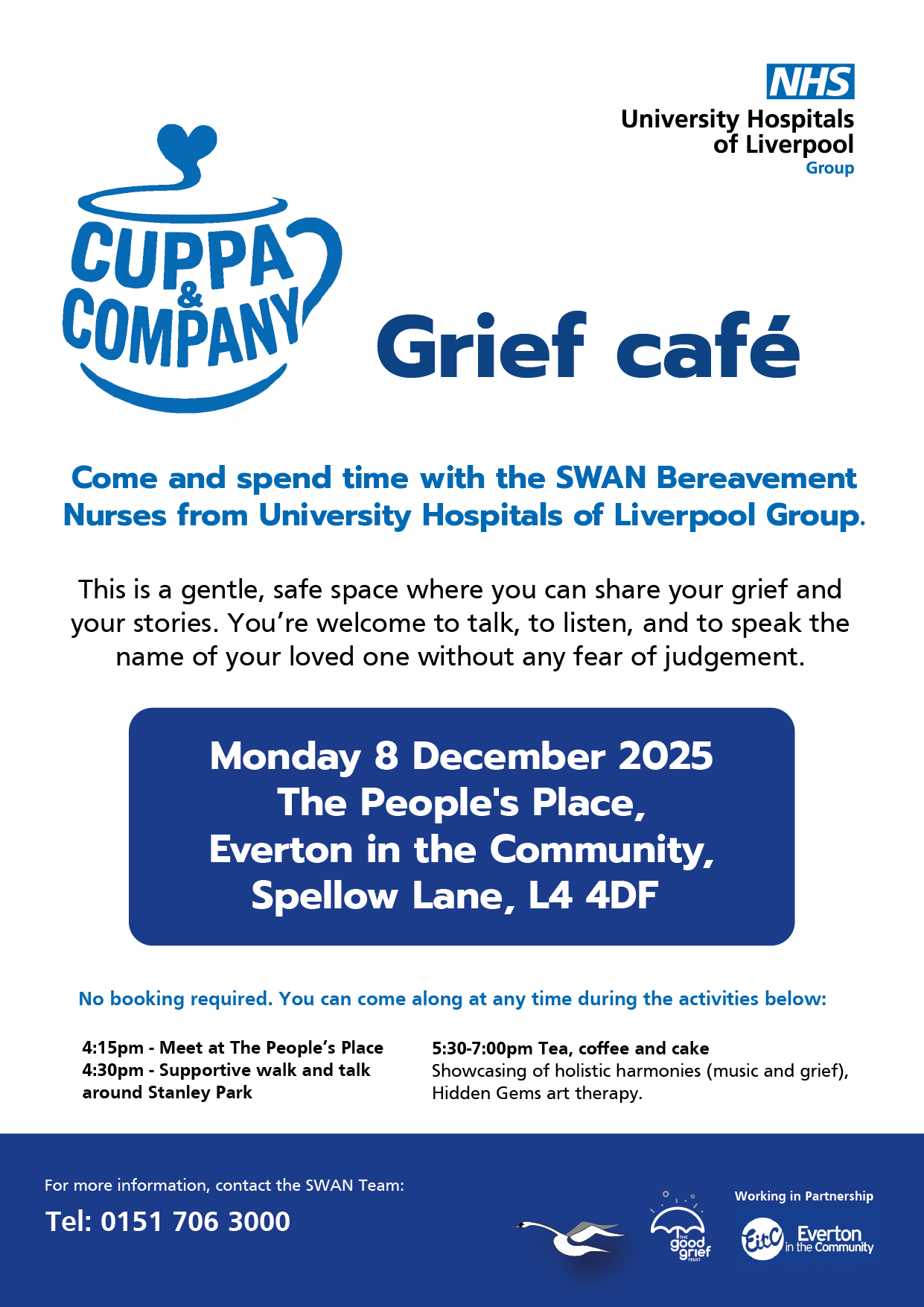 Come and spend time with the SWAN Bereavement Nurses from University Hospitals of Liverpool Group. This is a gentle, safe space where you can share your grief and your stories. You’re welcome to talk, to listen, and to speak the name of your loved one without any fear of judgement.