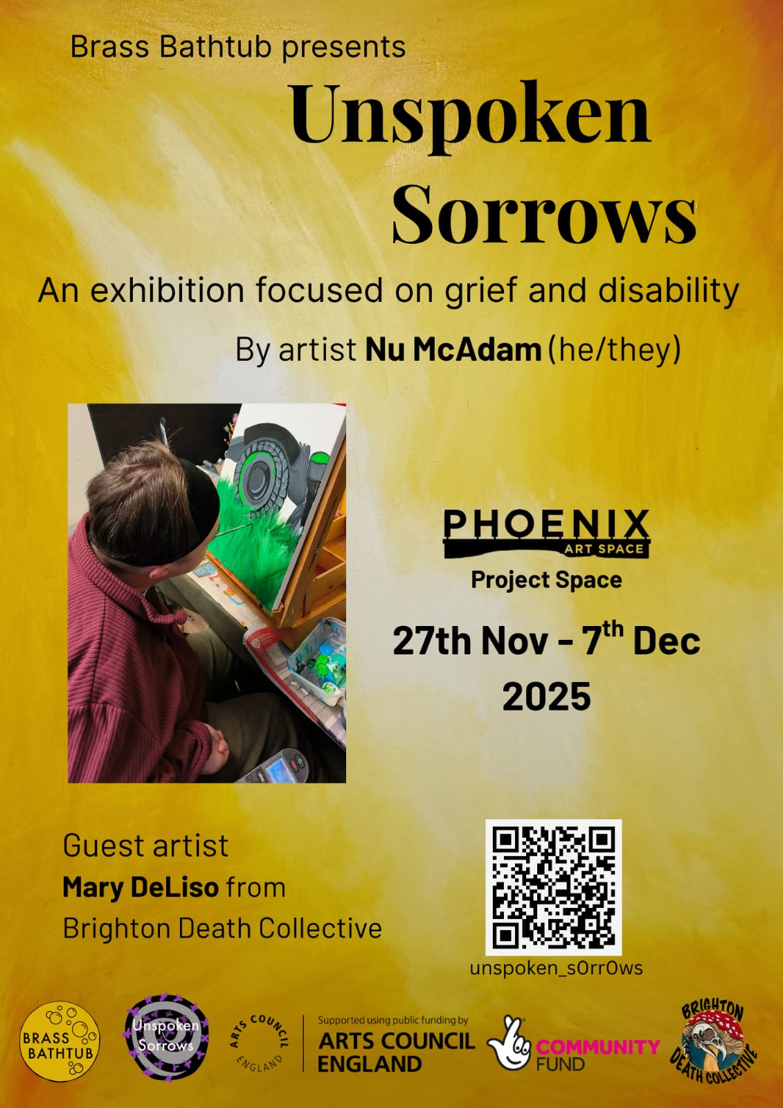 The exhibition concludes a two-year, UK-wide disability-arts project led by McAdam, a quadriplegic mouth painter exploring grief, healing, and creative expression. Developed through workshops and peer exchanges with disabled participants, Unspoken Sorrows reflects on how art can transform grief into connection and collective understanding.