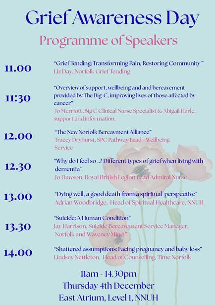 The Norfolk and Norwich University Hospital will be holding a grief awareness day on Thursday 4 December 2025, from 10am to 3pm. All are welcome to visit the stands and explore the support available across the Norfolk community. A Grief Cafe will be offering refreshments and there will be a programme of speakers between 11am and 2pm in the Ben Gooch Lecture Theatre.